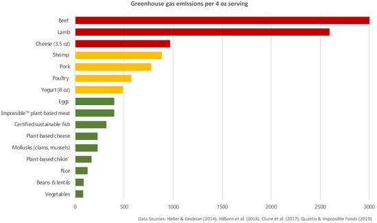 Firstly, each customizable item’s carbon footprint (g CO2 equivalent) was determined following the methodology described in Malan et al. []. Briefly, we used the Carbon Footprint Scorecard [] developed by UCLA based on estimates of GHG (Greenhouse Gas) emissions reported in the following four literature references: Heller & Keoleian, 2014 [], Clune et al., 2017 [], Hilborn et al., 2018 [], and Quantis & Impossible Foods (Khan et al., 2019) [] (Figure 1).