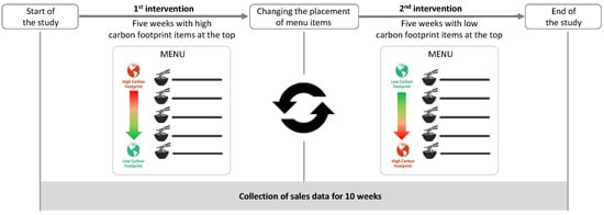 However, it is important to point out the inherent limitations of this research. First, the study tested only the two opposite interventions (i.e., highest carbon at the top and lowest carbon at the bottom and vice versa) and not including a control data collection when the menu was in alphabetical order, as usual. Since the study was initiated immediately after the reopening of the closed dining location during the pandemic, we had no information available that could serve as baseline data. This may have amplified the effect of the results; nevertheless, the increase in sales for items located at the top of the menu was confirmed in both the first and the second intervention for the highest- and lowest-carbon items, respectively. Second, due to the study design that only relied on the recording of sales data, it was not possible to obtain further information about customers and possible predictors of food choice, nor was it possible to assess the nudge effect over time. In addition, recruiting a sample of students and evaluating the intervention through their choices would have avoided possible biases related to different sales numbers between the two interventions. Moreover, all the students were on a meal plan, and the price of items was not a determining factor. Overall, these aspects represent starting points for future studies aimed at deepening how the placement of dishes on the menu affects university students’ food choices.