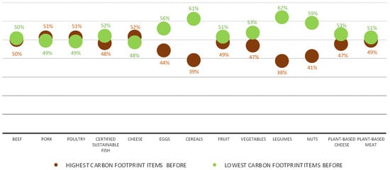 Figure 3 shows that the sales of all plant-based options significantly increased during the second intervention (i.e., low-carbon-footprint item at the top). Most notably, legumes, cereals, and nuts were the foods with the largest increase, followed by vegetables, plant-based cheese, and fruit. Among animal-based foods, eggs and certified sustainable fish options rose as well. Conversely, fewer sales were recorded for food items such as cheese, poultry, and pork when they were placed at the bottom. In addition, no significant changes were recorded for beef and plant-based meat options.