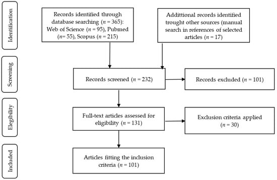 This systematic review was conducted according to the Preferred Reporting Items for Systematic Reviews and Meta-Analyses (PRISMA) guidelines 2020 as illustrated in Figure 1. Comprehensive research of the electronic Pubmed, Scopus and Web of Science databases was performed by the authors for the selection of papers published until May 2023. A search was performed using different combinations: the first one was (“green extraction” OR “GRAS extraction”) AND (“alginate” OR “pectins” OR “inulin”); the second one was (“Microbiota modulation AND (Alginate OR Pectin OR Inulin)”); and the last equation was (“Polyphenols AND (Pectins OR Alginate OR inulin) AND Microbiota”). Moreover, a manual search of articles referenced in selected papers was performed, considering the same eligibility criteria as further described in this section. A total of 382 articles were reported by these combinations, from which 150 duplicates were removed. After that, different eligibility criteria were applied. For the first combination, the screening was based on studies of by-products that had experimental data and green or GRAS extraction that have optimized instrumental variables by experimental designs, whereas in the others two combinations, the eligibility criteria were in vitro or in vivo studies including microbiota modulation analyses using dietary fibers as pectins, inulins and alginates and their combinations with phenolic compounds.