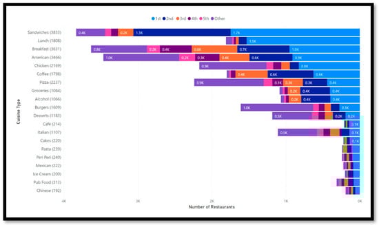 Figure 3 shows that pizza places are the most common cuisine type on the MDAs, with nearly 12,500 restaurants. Pizza, burgers, and breakfast are the cuisine types with the most restaurants.