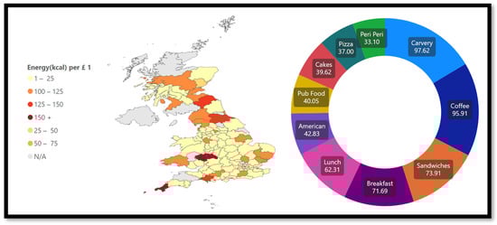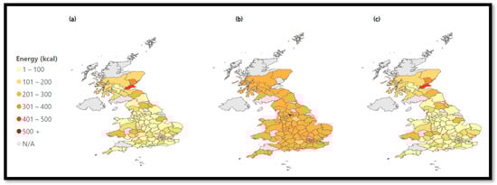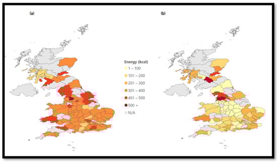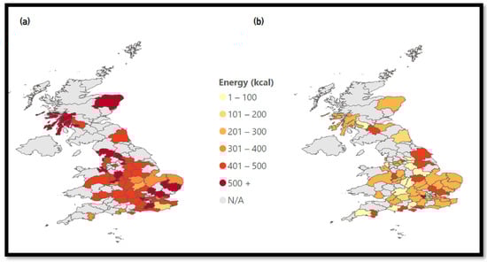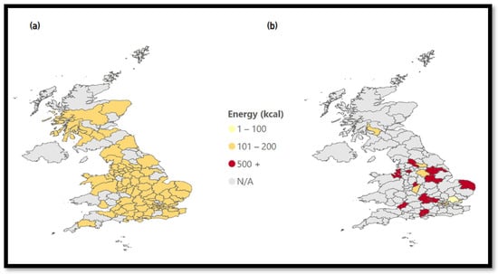 Figure 5b). The map changes color throughout the entire UK with average energy values between 301 and 400 kcal. This means that the most popular chains available on MDAs have higher average energy values compared to the rest.