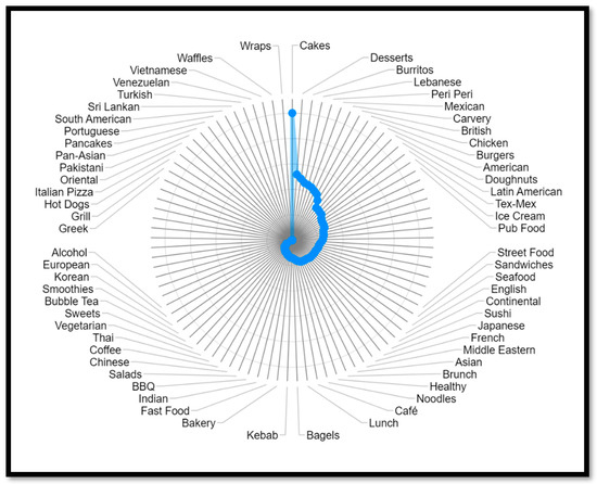 Figure 11 shows that the categories carvery (98 kcal per GBP 1), coffee (96 kcal per GBP 1), and sandwiches (74 kcal per GBP 1) have the highest amount of kcal available for GBP 1, while peri peri (33 kcal per GBP 1), pizza (37 kcal per GBP 1), and cakes (40 kcal per GBP 1) are on the lower end. Again, the variety of products and a list of the most popular products are necessary to understand consumer behavior.