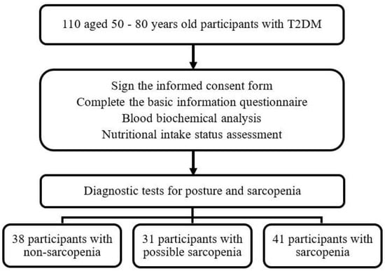Despite growing interest in diabetic sarcopenia in Taiwan, a limited number of studies have investigated the risk factors for sarcopenia in patients with T2DM. Moreover, most of these epidemiological studies did not observe the effects of nutritional intake, serum vitamin D level, or physical activity on the risk of sarcopenia. Furthermore, unlike the diagnostic criteria used by other studies, the present study used the latest 2019 AWGS guidelines [] as diagnostic criteria for sarcopenia. This study aimed (i) to compare the differences in blood biochemical values, nutritional intake, physical performance, and physical activity between patients with and without sarcopenia and (ii) to determine the risk factors of possible sarcopenia or sarcopenia among patients with T2DM in Taiwan.