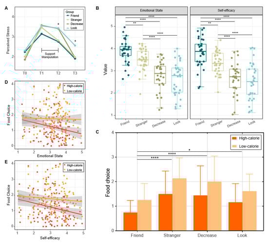 (A) Perceived stress in response to the laboratory stressor at four time points. Participants in the Friend and Stranger groups reported less perceived stress compared to the Decrease and Look groups at T2, and stress of the Look group was higher than other three groups at T3. (B) Results of the negative affect and self-efficacy ratings following each trial of the experiment. Participants felt less negative affect (1 = very negative, 5 = very positive) and more self-efficacy (1 = very little, 5 = very much) in the Friend and Stranger groups compared to the Decrease and Look groups. The regulation with the help of a friend was most effective. (C) Results of the high- and low-calorie food choices. Participants chose less high-calorie and low-calorie foods in the Friend group compared to the other three groups. (D) Relationship between negative affect and high/low-calorie food choice. Less negative affect was associated with less high-calorie food choice, but not low-calorie food choice. (E) Relationship between self-efficacy and high/low-calorie food choice. More self-efficacy was associated with less high-calorie food choice, but not low-calorie food choice. Note: * p < 0.05; ** p < 0.01; **** p < 0.001; T0, baseline; T1, post-stress induction; T2, post-support manipulation; T3, post-speech presentation. Error bars indicate standard error of the mean.