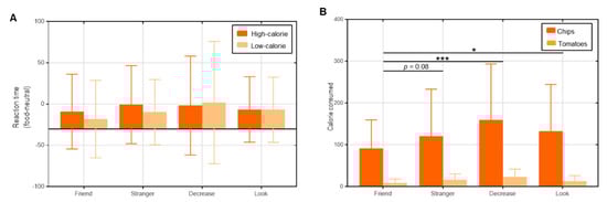 (A) Results of the reward sensitivity. There was no significant difference in reaction time (food minus neutral) among the groups and between the food types. (B) Results of the actual consumption. Participants in Friend group ate less calories than those in Stranger, Decrease and Look groups. Note: * p < 0.05; *** p < 0.005. Error bars indicate standard error of the mean.