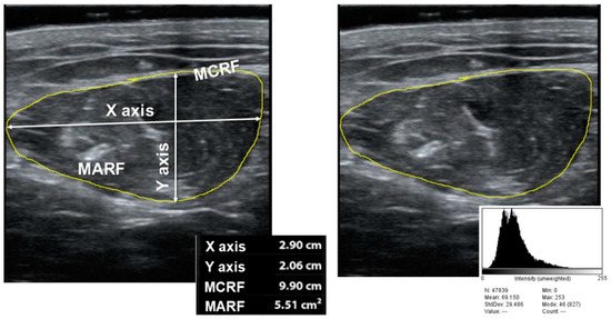 The variables that we measured to assess muscle mass were the anteroposterior (Y) and transversal muscle thickness (X), cross-sectional muscle area (MARF) and muscle circumference (MCRF) [15]. The area was standardized by height (muscle area (cm2)/height × height (m2) and is named the muscle area rectus femoris index (MARFI). The variables used to assess muscle quality were X-Y index ((Xaxis/Yaxis)/height2) that relate transversal and anteroposterior muscle thickness; on the other hand, we measured muscle echogenicity with Image J software, version 1.52p (National Institutes of Health (NIH), Bethesda, MD, USA) [22]; to display echogenicity, we consider 0 as complete black color and 255 as complete white color, we selected a region of interest (ROI) centered in QRF, and we take the median of the values. We standardize by the formula: (Median/255) × 100 (see Figure 1).