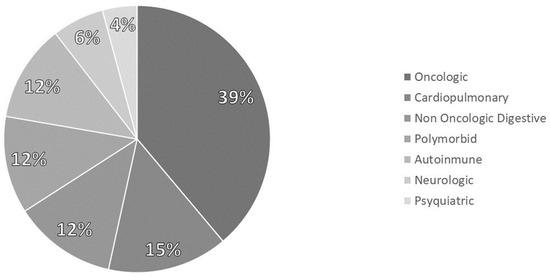 It analyzed 144 patients diagnosed with disease-related malnutrition (DRE). 60.4% of patients were women, and the average age was 61.4 (17.34). The pathologies which cause malnutrition are represented in Figure 2.