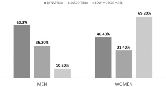The prevalence of sarcopenia with EWGSOP2 criteria was 33.30%. The low muscle mass criterion was fulfilled in 45.8% of patients, and the low muscle strength (dynapenia) was fulfilled in 51.4%. There were no differences in sarcopenia (p = 0.72) or dynapenia (p = 0.12) between sexes, but there were differences in low muscle mass criteria (p < 0.01) (Figure 3).