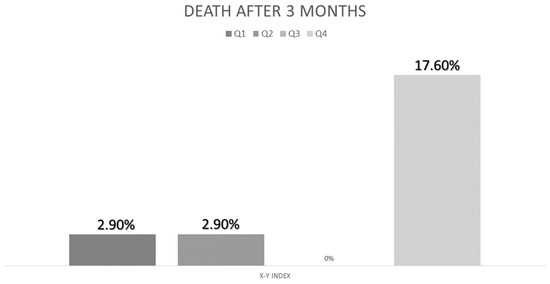 We compared the differences in ultrasonography parameters between those who suffered complications and those who did not. There were no differences between admitted patients and those who were not. There were no differences between patients who went to emergency services. Nevertheless, patients who suffered death had a higher X-Y index (4.67 (1.43) vs. 3.48 (1.32); p = 0.02) and a higher MCRFI than those who did not (3.86 (0.70) vs. 3.29 (0.59); p < 0.01). In the multivariate analysis adjusted by age, the highest quartile of the X-Y index has more risk of death OR: 4.54 CI95% (1.11–18.47); p = 0.03 (Figure 5).
