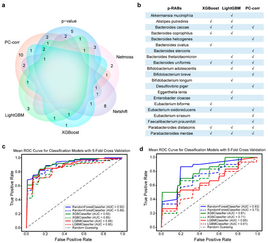 In summary, 52 p-RABs were ultimately identified as correlated with gut microbiome recovery (Supplementary Table S3), with 9 species identified in XGBoost, 12 in LightGBM, 10 in Netmoss, 16 in Netshift, 21 in p-value [21], and 23 in PC-corr. In particular, the PC-corr model can set different thresholds based on the correlation between features to discover more possible feature combinations. Here, we used three thresholds (cut-off), 0, 0.1, and 0.2, to obtain three p-RABs (number = 23, 21, and 12). The intersection between these methods is illustrated in the Venn diagram (Figure 1a).