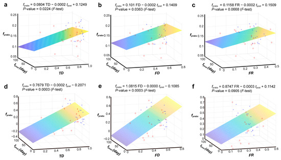 Multiple linear regression showed the effect of taxonomic diversity (TD), functional diversity (FD), and functional redundancy (FR) on recovery after antibiotic disturbance. (a,d) The taxonomic diversity (TD) from the Gini–Simpson index; (b,e) Rao’s quadratic entropy calculated as functional diversity (FD); and (c,f) the functional redundancy (FR) of gut microbiota, associated with days after antibiotic treatment and the two types of the fraction of p-RABs: (a–c) the number of present p-RABs; (d–f) the relative abundance ratio of p-RABs. Blue nodes represent recoverers and red nodes represent non-recoverers. These p values were calculated from the F test.