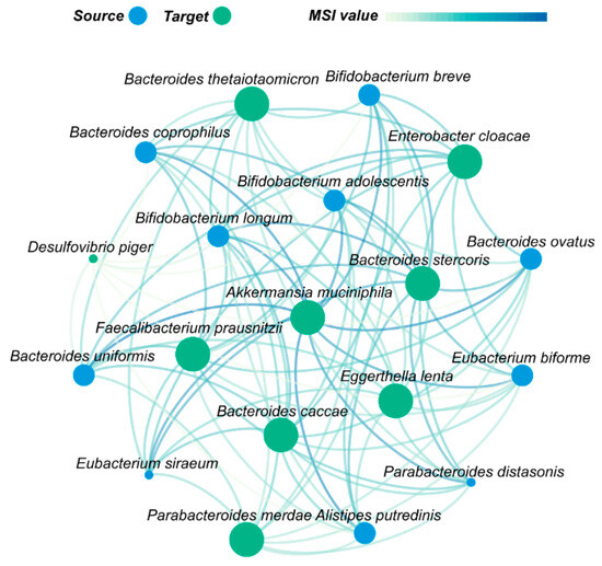 Restoration of natural ecosystems is often driven by ecological interactions [54,55]. To understand the predictive p-RABs’ interactions and evaluate the benefits of the co-culture of different species, we built a microbial metabolic support interactions network (Figure 3, more details in Supplementary Table S5) using the Mequest algorithm [35] based on a genome-scale metabolic model [34]. The network showed that blue nodes—such as Bacteroides ovatus and Bacteroides uniformis—were able to provide some degree of metabolic support to other green nodes, suggesting synergism between them. These blue nodes contain the species highlighted at the bottom of the food web (Supplementary Figure S5) and are all Bacteroides spp. The food web from bottom to top represents a clear dependency among bacteria within the intestinal microbiome. Specifically, the existence of species B (top level) seems to depend on the existence of species A (bottom level), whereas the reverse relationship is not true.