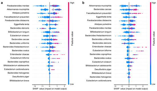 Ranking of feature importance of p-RABs based on SHAP package. (a) The feature importance ranking of the 21 p-RABs by the XGBoost classifier. (b) The feature importance ranking of the 21 p-RABs by the LightGBM classifier. The node color indicates the feature value, red to blue is the direction of the feature value decrease, and the SHAP value indicates whether the feature has a positive, negative, or no effect on the prediction.