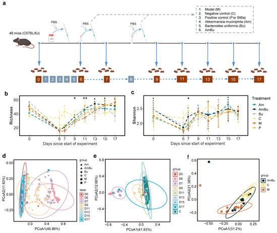 To investigate the synergistic effects of Akkermansia muciniphila and Bacteroides uniformis on intestinal microbial recovery after antibiotics, C57BL/6J healthy male mice were used for in vivo experiments. Apart from the negative control group, the mice were treated with antibiotics for five days, and then randomly divided into the following five groups to study the therapeutic effect: model group (1 × PBS); positive control group (a combination of Bacteroides thetaiotaomicron and Bifidobacterium adolescentis) [21]; Am group (Akkermansia muciniphila); Bu group (Bacteroides uniformis); and AmBu group (a combination of Akkermansia muciniphila and Bacteroides uniformis). Intestinal microbiome recovery was monitored using stool samples collected at eight time points over an 18-day period, and the microbiome was analyzed by 16S rRNA sequencing, with six mice per group (Figure 5a).