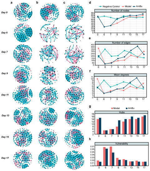 To better understand the changes in the gut microbial network in the AmBu group, Spearman correlation networks were constructed at eight different time points (detailed in the Methods section; Figure 6a–c). The number of nodes, edges, and mean degrees in the AmBu networks increased more after antibiotic disturbance than those in the model networks (Figure 6d–f). We also found that the number of hub nodes (the top 20% degrees of nodes as hub nodes) in the model networks increased slowly and only equaled half the number of AmBu networks on day 9 (Figure 6g). Moreover, the vulnerability [42] (robustness; see Section 2) of AmBu networks was always lower than that of the model networks (Figure 6h). These results indicate that the AmBu microbial networks were more stable over time.