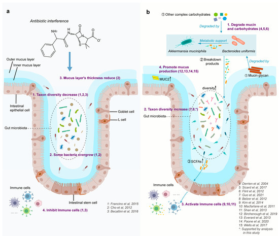 A model for gut microbiome based on observations and prior knowledge after antibiotic disturbance. (a) The left diagram simulates the effect of antibiotic disturbance on the gut, which is the premise of our intervention; the changes in the intestinal environment are shown in four ways [67,68,69]. (b) On the right, Am and Bu bacteria were provided by intragastric administration. There are three forms of carbon source transformation in the figure. Am and Bu can better colonize epithelial mucous membranes because they degrade mucus and dietary plant-, animal-derived carbohydrates (step 1) [70,71,72], then they break down carbohydrates and promote the growth of other species (step 2) [63,73]. Am, Bu, and the gut microbiota can produce more short-chain fatty acids (SCFAs) for the growth of colonocytes [74,77,78,79], which also activate immune cells (step 3) [75,76,80].