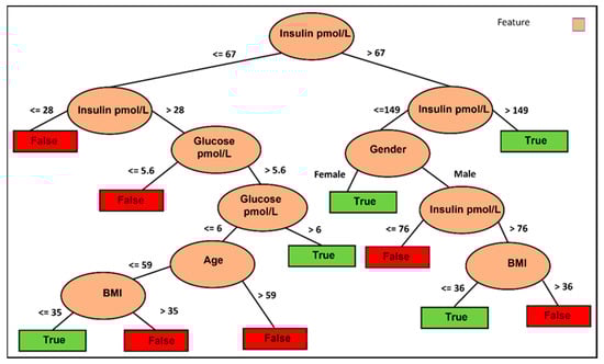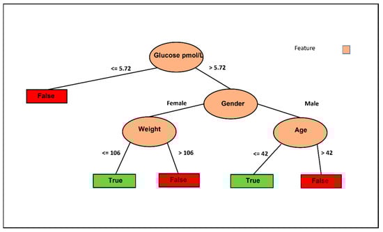 Figure 3 illustrates the decision tree based on the J48 classifier using only fasting glucose without the intervention columns but with control. Six decision pathways are depicted, with four resulting in a False decision and two leading to a True decision. Lower basal fasting glucose tends to lead to a False decision, while being a female with lower weight favors a True decision. Conversely, being a female with higher weight leans towards a False decision. Additionally, older males tend to result in a False decision, whereas younger males tend to result in a True decision. These results are logical and allow us to conclude that weight is the crucial feature for females, while age is the determining factor for males.
