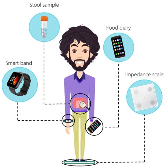 Data acquisition. Representation of the wearables, devices, and techniques used to extract the comprehensive data integrated into the personalized approach from the participants. An impedance scale allows evaluating anthropometric parameters; the smart band furnishes information regarding physiological parameters and physical activity data; the web app ArMOnIA ensures a detailed compilation of food diary; the collection of a stool sample is required for microbiome analysis.