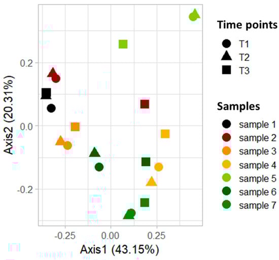 Beta diversity analysis between T1, T2, and T3. Beta diversity was investigated using Bray–Curtis distance and represented by principal coordinates analysis (PCoA). Statistical differences between the three groups (T1 and T2, as control groups, and T3 after diet) were assessed by Permutational Multivariate Analysis of Variance (PERMANOVA) test (p > 0.05). Different shapes represent different time points while varying colors are associated with the various studied samples.