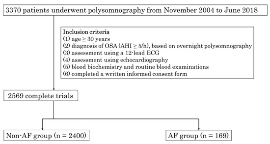 Between November 2004 and June 2018, a total of 3370 patients who had undergone polysomnography at Tokyo Medical University were consecutively enrolled in this study. Figure 1 illustrates the selection process of the study cohort. The inclusion criteria comprised: (1) age ≥ 30 years; (2) diagnosis of obstructive sleep apnea (defined as an apnea-hypopnea index (AHI) ≥ 5/h) based on an overnight polysomnography; (3) evaluation using a 12-lead ECG or examination of medical records; and (4) assessment via echocardiography. Subsequently, blood samples were collected for biochemical analysis and routine blood examinations. A total of 2569 patients were included in the analyses. Hypertension was defined as a systolic/diastolic blood pressure of ≥140/90 mmHg and/or current use of antihypertensive medications. Diabetes mellitus was determined by a prior diagnosis in medical records, a hemoglobin A1c value (as calculated by the National Glycohemoglobin Standardization Program) of ≥6.5%, or treatment with oral antidiabetic medications or insulin. Chronic kidney disease (CKD) was characterized by an estimated glomerular filtration rate (eGFR) < 60 mL/min/1.73 m2. The study was conducted with the approval of the Ethical Guidelines Committee of Tokyo Medical University (No. T2019-0216) in adherence to the principles of the Declaration of Helsinki.