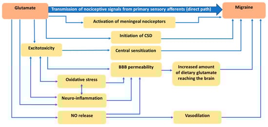 Notably, besides being an endogenous source, glutamate is a non-essential amino acid found in the diet []. In a normal situation, the amount of dietary glutamate entering the brain is regulated by saturable transporters on the BBB []. However, considering the probability of diminished BBB integrity in migraine patients [,,,,], it is likely that the amount of dietary glutamate entering the brain is higher than in healthy individuals. This idea is supported by multiple studies that have shown that MSG administration can induce headaches [,,]. Moreover, some dietary components could have a triggering effect on a migraine attack as reported by patients in epidemiological studies [,]. The contribution of dietary triggers in migraines was the basis for the development of elimination diet strategies []. However, precisely determining random food triggers is challenging, and a diet that is overly restrictive can have a long-term negative effect on nutritional status [,]. Until now, no specific diet has been developed for migraine prevention, and several proposed diets have shown varying levels of efficacy []. Taken together, both dietary triggers and nutrient intake might be key to therapeutic benefits in migraine, which has not been possible with current interventions.