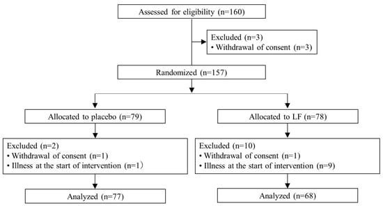 Participants were recruited from 20 June to 24 June 2022, and the 160 subjects provided informed consent. Among them, three withdrew consent. A total of 157 subjects were randomized and allocated to two groups (placebo, n = 79; LF, n = 78). The baseline characteristics of the groups were comparable (Table 1).