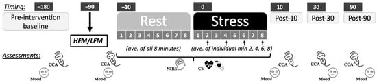 The present study was a cross-over intervention study, with two laboratory visits at least a week apart for males, and approximately a month apart for females. The order of dietary conditions was randomised and counterbalanced. Participants visited the lab at 08:00 h and were asked to refrain from food 12 h before, and from alcohol, vigorous exercise, and caffeine 24 h before each testing session. We also requested that participants followed a similar diet for 24 h prior to each visit. Pre-intervention peripheral vascular measurements were assessed (data reported elsewhere: [28]) as well as common carotid artery (CCA) diameter and blood flow, prior to consumption of a high-fat or low-fat meal. After 1 h 15 min, prefrontal cortical haemodynamics were assessed using near-infrared spectroscopy (NIRS) during an 8-min rest (Rest) and during an 8-min mental stress task (Stress) (Figure 1). Cardiovascular activity was also recorded throughout rest and stress. Immediately following stress, CCA diameter and blood flow were assessed (Post-10). CCA diameter and blood flow were also measured 30 min (Post-30) and 90 min (Post-90) following stress. Each session lasted 5 h, and participants were debriefed following completion of both visits.