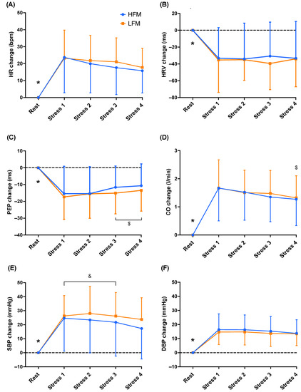 Time course of cardiovascular responses (HR (A), HRV (B), PEP (C), CO (D), SBP (E), DBP (F)), during rest and stress following either an HFM or LFM. Data are presented as reactivity mean ± standard deviation. n = 20 (A–D)/19 (E,F). * Significantly different compared to Stress 1, 2, 3, and 4, $ significantly different compared to Stress 1, & significantly different compared to Stress 4. HR: heart rate, HRV: heart rate variability, PEP: pre-ejection period, CO: cardiac output, SBP: systolic blood pressure, DBP: diastolic blood pressure, HFM: high-fat meal, LFM: low-fat meal.