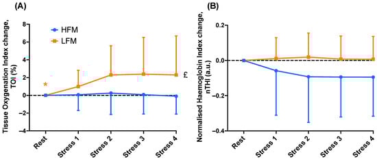 One sample t-tests revealed that TOI was significantly greater during stress compared to rest in the LFM condition (p = 0.005) but not the HFM condition (Figure 3). There were no significant differences in nTHI during stress compared to rest in both conditions.