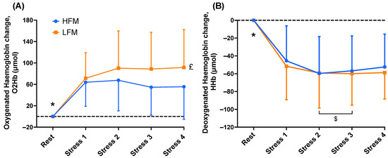 Time course of prefrontal cortical haemodynamics (O2Hb (A) & HHb (B)) during rest and stress following either an HFM or LFM. Data are presented as reactivity mean ± standard deviation. n = 19. * Significantly different compared to stress (t-test), £ significantly higher following LFM compared to HFM, $ significantly different compared to Stress 1. O2Hb: oxygenated haemoglobin change, HHb: deoxygenated haemoglobin change, HFM: high-fat meal, LFM: low-fat meal.