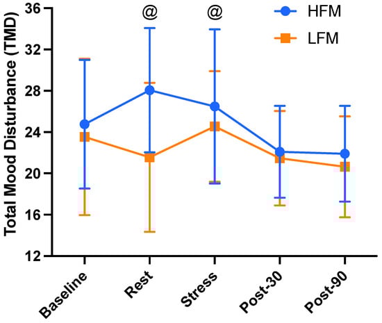Time course of total mood disturbance at baseline, rest, immediately post-stress, and 30 and 90 min post-stress, following either an HFM or LFM. Data are presented as mean ± standard deviation. TMD = (Tension + Anger + Fatigue + Depression + Confusion) − Vigour. n = 18. @ Significant difference between HFM and LFM at these time points. TMD: total mood disturbance, HFM: high-fat meal, LFM: low-fat meal.