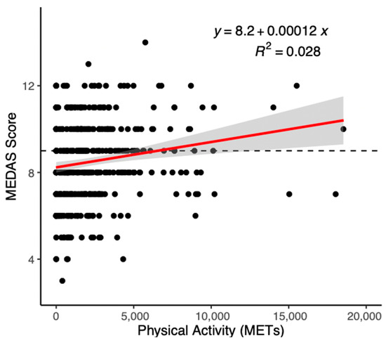 Scatter plot of the relationship between MEDAS score and physical activity. Note: MEDAS, Mediterranean Diet Adherence Screener; METs, Metabolic Equivalent of Task.