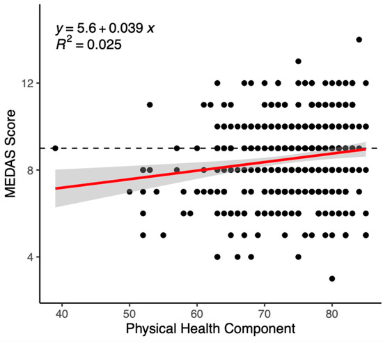 Scatter plot of the relationship between MEDAS score and the physical health component of hrQOL. Note: hrQOL, health-related quality of life; MEDAS, Mediterranean Diet Adherence Screener.