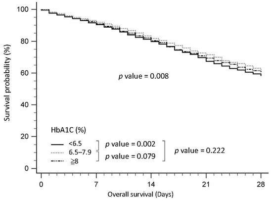 This study encompassed a total of 4847, 6050, and 4987 patients diagnosed with sepsis, categorized into three groups based on their HbA1c levels: <6.5%, 6.5–7.9%, and ≥8.0% (see Table 1). Notably, the group with HbA1c ≥ 8.0% was characterized by a younger age profile (mean age = 60.9, p < 0.001), the highest mean body mass index (BMI; 24.6 kg/m2, p < 0.001), and the lowest proportion of females (40.1%, p < 0.001). Additionally, this group exhibited the lowest percentages of patients with pneumonia (33.8%, p < 0.001), urinary tract infections (17.4%, p < 0.001), vasopressor use (21.8%, p = 0.048), ventilator use (49.9%, p < 0.001), and hemodialysis (17.2%, p < 0.001).