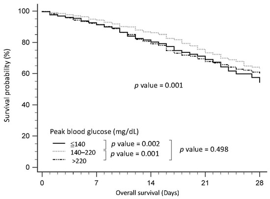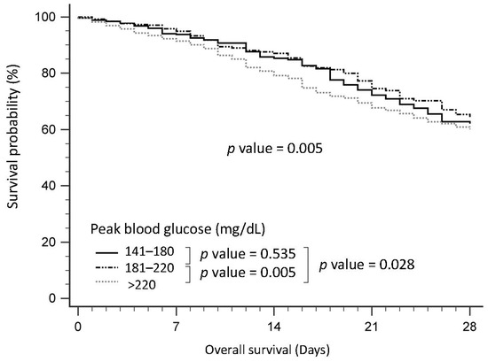 In Figure 3, we present the survival curves of patients with peak glucose levels exceeding 140 mg/dL. Within this subgroup, those with peak glucose levels surpassing 220 mg/dL exhibited significantly poorer survival outcomes compared to individuals with peak glucose levels between 141–180 mg/dL (p = 0.028) or 181–220 mg/dL (p = 0.005).