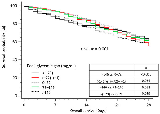 Figure 5 presents the survival curves of sepsis patients categorized by their peak glycemic gap. Notably, patients with a peak glycemic gap exceeding 146 mg/dL exhibited significantly poorer survival compared to those with peak glycemic gaps of 0–72 mg/dL (p < 0.001), −72 to −1 mg/dL (p = 0.024), or 73–146 mg/dL (p = 0.011). Furthermore, the group with a peak glycemic gap below −73 mg/dL experienced worse survival outcomes than the group with a peak glycemic gap of 0–72 mg/dL (p = 0.049).