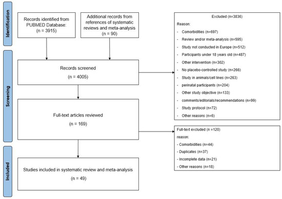 The comprehensive literature search (PUBMED, through 2 January 2022) identified a total of 4005 studies and references from systematic reviews and meta-analyses, of which 49 interventional and placebo-controlled studies (48 RCT and 1 CT) that contained a total of 73 vitamin D study arms fulfilled the inclusion/exclusion criteria and could be included in this meta-analysis, as shown in Figure 1. The studies were published from 1995 to 2021, spanning a research period of 26 years. All studies were conducted in Europe.