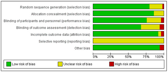 The risk of bias of the 49 included studies in the meta-analysis was assessed and found to be rated as quite low (Figure 2). The Cochrane risk-of-bias tool includes seven categories, for which each study is assessed based on three grades [75]. Only selective reporting was rated as unclear for all studies, as it was not possible to verify whether all prespecified analyses in the protocol were also reported.