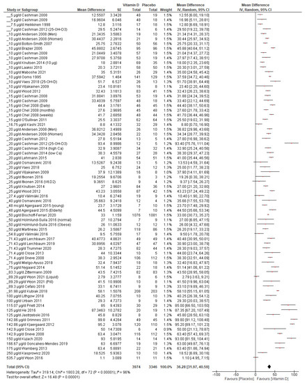 Forest plot of all included studies (arms). Created with Review Manager v.5.4.1 [17]. The effect of vitamin D supplementation (right side of the graph) on serum 25(OH)D increment compared with placebo was demonstrated in all studies [26,27,28,29,30,31,32,33,34,35,36,37,38,39,40,41,42,43,44,45,46,47,48,49,50,51,52,53,54,55,56,57,58,59,60,61,62,63,64,65,66,67,68,69,70,71,72,73,74]. With the exception of 6 studies that crossed the zero line, this effect was also statistically significant [43,61,68,72,73].