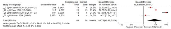In an exploratory subgroup analysis, vitamin D supplementation variants D2 and 25(OH)D were examined separately from D3. The weighted mean difference in the serum 25(OH)D increase (36.28 nmol/L (95% CI 31.97, 40.59; p < 0.00001)) between vitamin D and the placebo in the total population decreased slightly to 35.78 (95% CI 31.38, 40.18; p < 0.00001) after the exclusion of studies with vitamin D2 and 25(OH)D. The subgroups with supplemented vitamin D2 and 25(OH)D in Figure 4 showed a strong increase in serum 25(OH)D compared to the placebo, with a weighted mean difference of 45.75 (95% CI 15.99, 75.50; p = 0.003). Despite the fact that only one trial of vitamin D2 was included, it appeared that these results were predominantly due to the effect of the 25(OH)D supplementation trials.