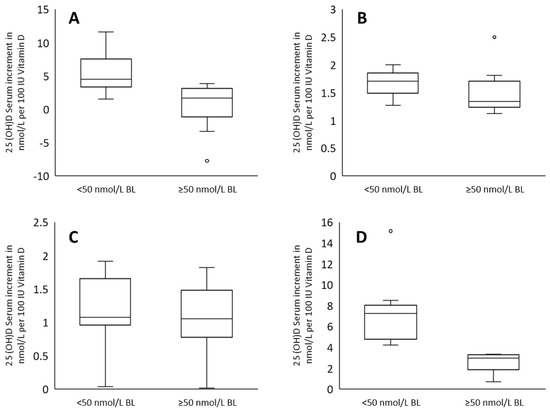 Within each box, horizontal lines denote median values; boxes extend from the 25th to the 75th percentile of each group’s distribution of values; vertically extending lines denote adjacent values (i.e., the most extreme values within 1.5 interquartile range of the 25th and 75th percentiles of each group); dots denote observations outside the range of adjacent values. The relative serum 25(OH)D increment per 2.5 μg daily vitamin D dependent on baseline 25(OH)D levels <50 and ≥50 nmol/L are shown for (A) age 18–59 years with <38 μg/day vitamin D, (B) age 18–59 years with ≥38–<75 μg/day vitamin D, (C) age 18–59 years with ≥75 μg/day vitamin D, and (D) age ≥60 years with <38 μg/day vitamin D. On the one hand, it was shown that baseline 25(OH)D levels <50 nmol/L achieved a greater serum increment per 2.5 μg of vitamin D (100 IU) per day regardless of the supplemented vitamin D dose. On the other hand, however, it also appeared that this relative serum increment was most pronounced in the low-dose category and always decreased with higher doses. In addition, it was also shown that the older population achieved a greater serum increment per 2.5 mcg of daily vitamin D compared to the younger population with low-dose vitamin D.