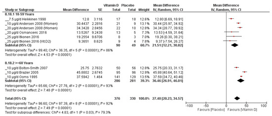 Subgroup analysis of women with low dose, 18–59 vs. ≥60 years. Created with Review Manager v.5.4.1 [17]. Both subgroups showed significant weighted mean difference between vitamin D supplementation versus placebo (both p < 0.00001), despite significant and substantial heterogeneity. The serum increase with vitamin D supplementation was significantly greater in the older population than in the younger population (p = 0.03), although the heterogeneity in the results of the studies of both subgroups could not be explained by this subgroup analysis [27,29,30,41,43,60,61].