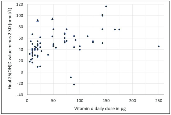 Figure 7 shows, for all included studies, the scatter plot of the final serum 25(OH)D values and their respective daily doses of vitamin D. Rising final serum 25(OH)D levels are shown with increasing daily vitamin D dosing. A total of 38% of the studies were able to achieve final mean serum 25(OH)D levels of at least 50 nmol/L with the vitamin D dosage specified in these studies. The study by Wyon et al. (2016) [72] was identified as an outlier and was excluded from t”e gr’ph. The reason for this was the single bolus of vitamin D of 3750 μg with a 7-day observation, which resulted in the herein-calculated dose of 535.7 μg of vitamin D. On the other hand, the 25(OH)D values shown as means minus 2 SD were calculated as negative values for the supplemented arms of the studies by Wyon et al. (2021, “Liquid” arm) [73], and the study by Zittermann [74] actually showed a reduction in final serum 25(OH)D levels. The most likely cause of the negative values for mean minus 2 SD is poor compliance among study subjects, as implied by the fact that the standard deviation was dramatically increased in the vitamin D groups compared to baseline values and the placebo group’s final values. Despite the compliance issue, an additional explanation for the “Liquid” arm of the study from Wyon et al. was seen by the authors in the application of 100.000 IU vitamin D over a 24 h period, whereas the reduced efficacy of a bolus of oral liquid versus a slower-release pill may be due to the rate-limited hepatic hydroxylation of vit D to 25(OH)D following rapid intestinal absorption. In particular, if taken all at once, this may have saturated the absorption capacity of the intestine, so a dosed intake of three intakes over a 24 h period might have been more effective [73]. Other points of interest in Figure 7 appear in the two strongest post-intervention serum 25(OH)D increments at daily doses up to 50 mcg/day vitamin D (the two triangles within the scatter plot). On the one hand, this applied to the arm of the study by Cashman et al. with 20 μg/day 25(OH)D, whose 4-5-fold higher potency compared with vitamin D3 was confirmed here once again [33], and on the other hand, in the study arm of the older population in the study by Agergaard et al., a supplemented daily dose of vitamin D of 48 μg showed a further significant increase in serum 25(OH)D levels, even at a baseline value as high as 70 nmol/L [26].