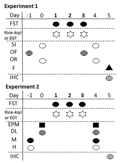 Rice-koji (Low or High doses) and EGT (0.1 or 1.0 mg/kg) were administered orally at 0.2 mL/mouse through a stomach tube 30 min and 6 h after each Sham or FST experiment on Days 1, 2, and 3 (Figure 1).