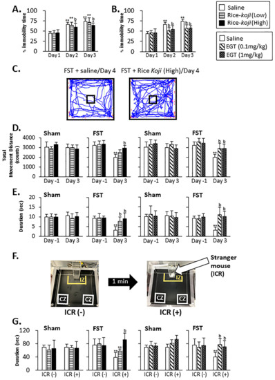 Figure 2. Effect of daily administration of Rice-koji and EGT on anxiety-like behaviors induced by repeated forced swim stress treatment (FST). Data summary for the effect of Rice-koji (A) and EGT (B) on time spent on non-swimming behaviors (immobility time). Examples of the open field (OF) area with the mouse trail are depicted (C), and the small square located in the middle of the OF area was arbitrarily designated as the center area. The data summary for the effect of Rice-koji and EGT on the total movement distance (D) and the time spent in the center area (E) during the OF test. The experimental procedures for the SI test (F). The SI test consisted of two sessions in the absence (ICR (−), 2.5 min) and presence (ICR (+), 2.5 min) of a stranger mouse placed inside the perforated acrylic enclosure in the middle of the interaction zone (IZ), and the time spent within the IZ was recorded. Data summary for the effect of Rice-koji and EGT on time spent within the IZ for Sham and FST mice (G). * p < 0.05, ** p < 0.01 versus Day 1 (A,B), Day −1 (D,E), or ICR (−) (G) with the same treatment group. b p < 0.01 versus the saline-treated group after FST (A,D,E) or that with ICR (+) (G). The sample size was analyzed in the FST: FST + saline = 20; FST + Rice-koji (Low dose) = 20; FST + Rice-koji (High dose) = 20; FST + EGT (0.1 mg/kg) = 20; FST + EGT (1.0 mg/kg) = 20. The sample size was analyzed in the OF and SI test: Sham + saline = 10; Sham + Rice-koji (Low dose) = 7; Sham + Rice-koji (High dose) = 8; Sham + EGT (0.1 mg/kg) = 10; Sham + EGT (1.0 mg/kg) = 10; FST + saline = 10; FST + Rice-koji (Low dose) = 10; FST + Rice-koji (High dose) = 10; FST + EGT (0.1 mg/kg) = 9; FST + EGT (1.0 mg/kg) = 10.
