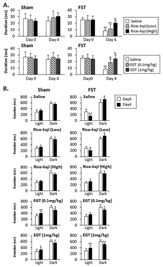 Figure 3. Summary data for the effect of Rice-koji and EGT on anxiety-like behaviors. The elevated plus maze and dark and light box tests were conducted in Sham and FST mice on Day 0 and Day 4. Time spent within the open arms (A) and the light and dark room (B) was compared between Day 0 and Day 4. * p < 0.05, ** p < 0.01 versus Day 0 in the same treatment group. b p < 0.01 versus the saline-treated group after FST. Sample size: Sham + saline = 10; Sham + Rice-koji (Low dose) = 11; Sham + Rice-koji (High dose) = 10; Sham + EGT (0.1 mg/kg) = 10; Sham + EGT (1 mg/kg) = 10; FST + saline = 10; FST + Rice-koji (Low dose) = 10; FST + Rice-koji (High dose) = 10; FST + EGT (0.1 mg/kg) = 10; FST + EGT (1.0 mg/kg) = 10.