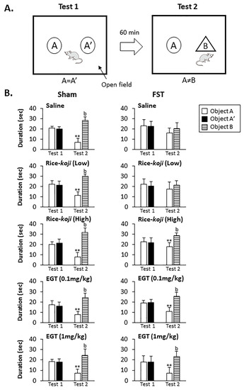 The first aim of this study was to determine whether Rice-koji extracts (Rice-koji) can prevent anxiety- and pain-like behaviors under psychophysical stress conditions. In a parallel study, the effects of EGT on these responses were evaluated. These experiments could elucidate the possible molecular basis for the modulatory effects of Rice-koji on psychophysical stress responses in part. A paradigm of repeated forced swim stress (FST) was conducted to develop a psychophysical stress model in mice [17]. Multiple behavioral procedures were employed to evaluate the status of psychological stress, allowing us to assess the different aspects of psychological domains [18]. Further, the effects of Rice-koji and EGT on cognitive functions were also determined because psychological stress can cause cognitive impairments [19]. The novel object recognition (OR) test was conducted to assess short-term memory and learning [20,21]. Further, the effect of Rice-koji and EGT on pain-like behaviors under FST conditions was determined. A report revealed the inhibitory roles of EGT on neuropathic pain-like behaviors [15]; however, it remains unknown whether Rice-koji and EGT have inhibitory effects on nociception associated with psychological stress conditions.