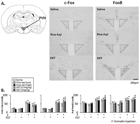 In FST mice, EGT, but not Rice-koji, increased formalin-evoked c-Fos expressions in the PVN compared with saline treatment (Figure 6, left panel), while Rice-koji and EGT increased formalin-evoked FosB expressions (Figure 6, right panel). These findings indicated that the preventive roles of EGT on neural responses were greater than those of Rice-koji, and the effects of both treatments on FosB expressions might be greater than on c-Fos expressions. Collectively, despite distinct response patterns of c-Fos and FosB expression, Rice-koji and EGT could have preventive roles on the induction of neural changes in the PVN under psychophysical stress conditions.