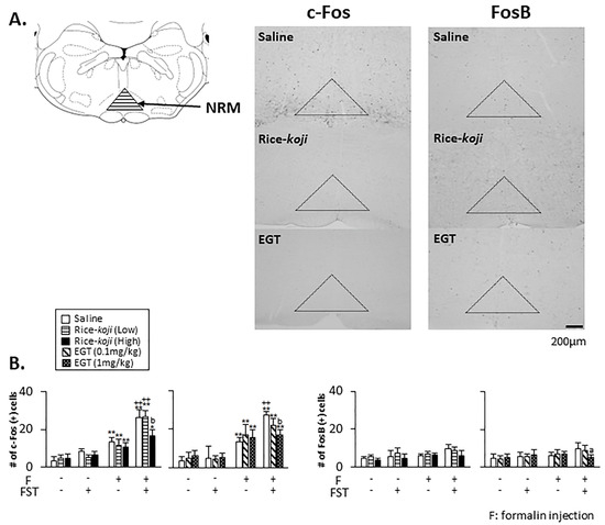Psychological stress causes dysfunction of the descending pain controls [64]. Neural changes in the NRM and DH, key components of the descending pain controls, induce chronic pain [9,25,26,65]. In the absence of formalin injection, c-Fos and FosB expressions in the NRM and DH of FST mice were not affected (Figure 7 and Figure 8), although other stress models increased these [27,39]. The c-Fos and FosB expressions associated with psychological stress conditions alone might depend on the types of stress models, which were not affected by Rice-koji and EGT.